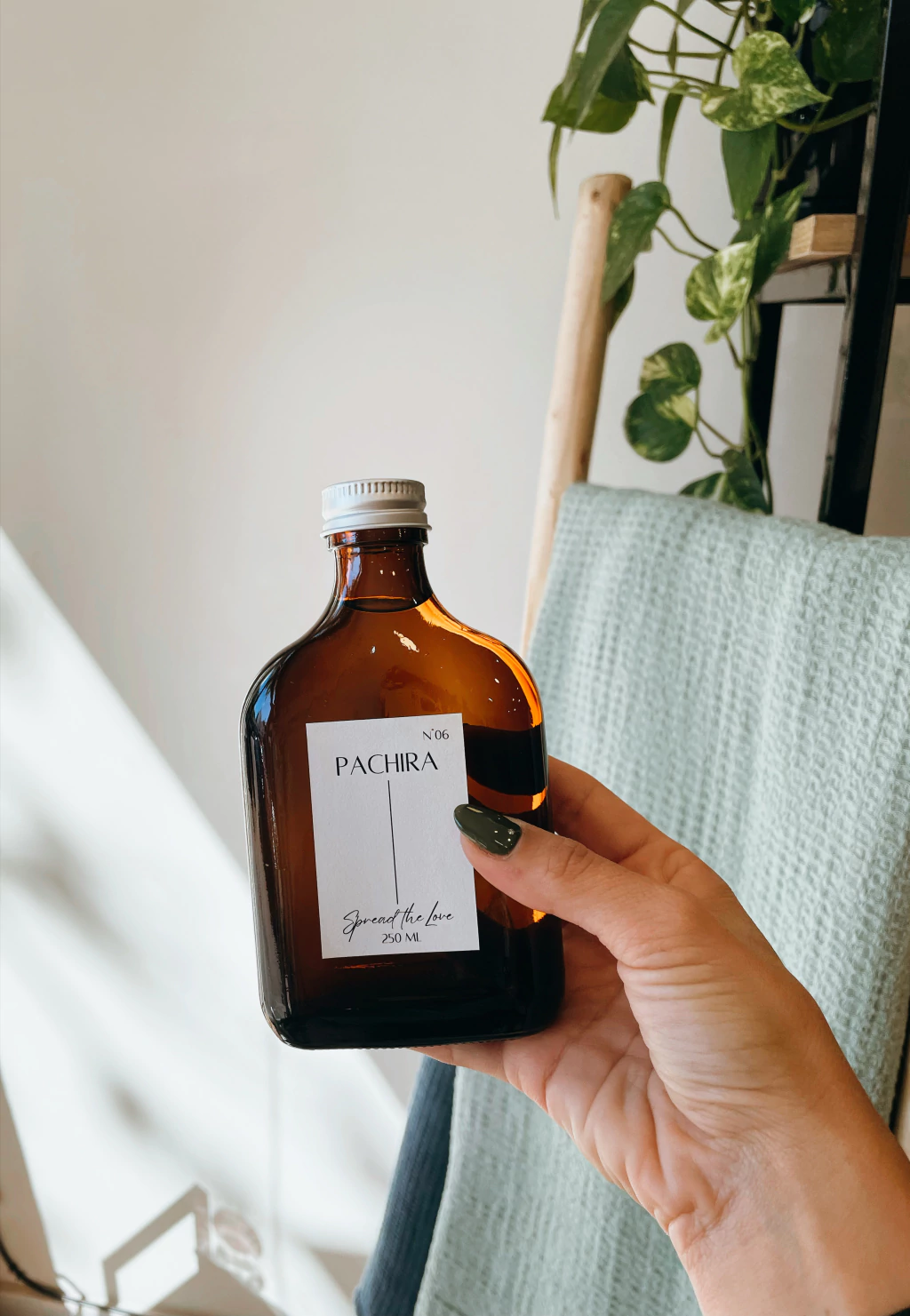 Diseño: Presentado en un frasco de vidrio de 250 ml con tapa metálica y una etiqueta de diseño minimalista. Su transparencia permite apreciar la claridad de nuestras esencias, integrándose con naturalidad en cualquier estilo decorativo.