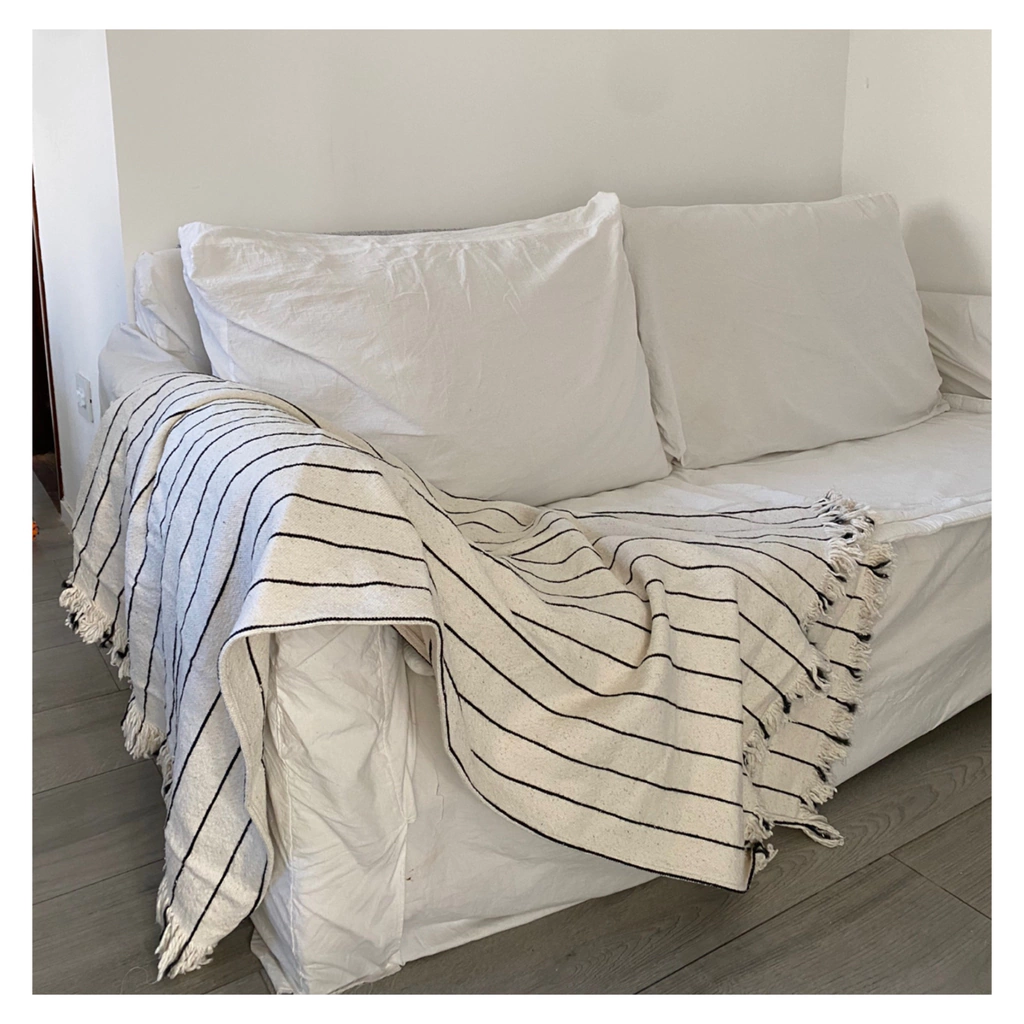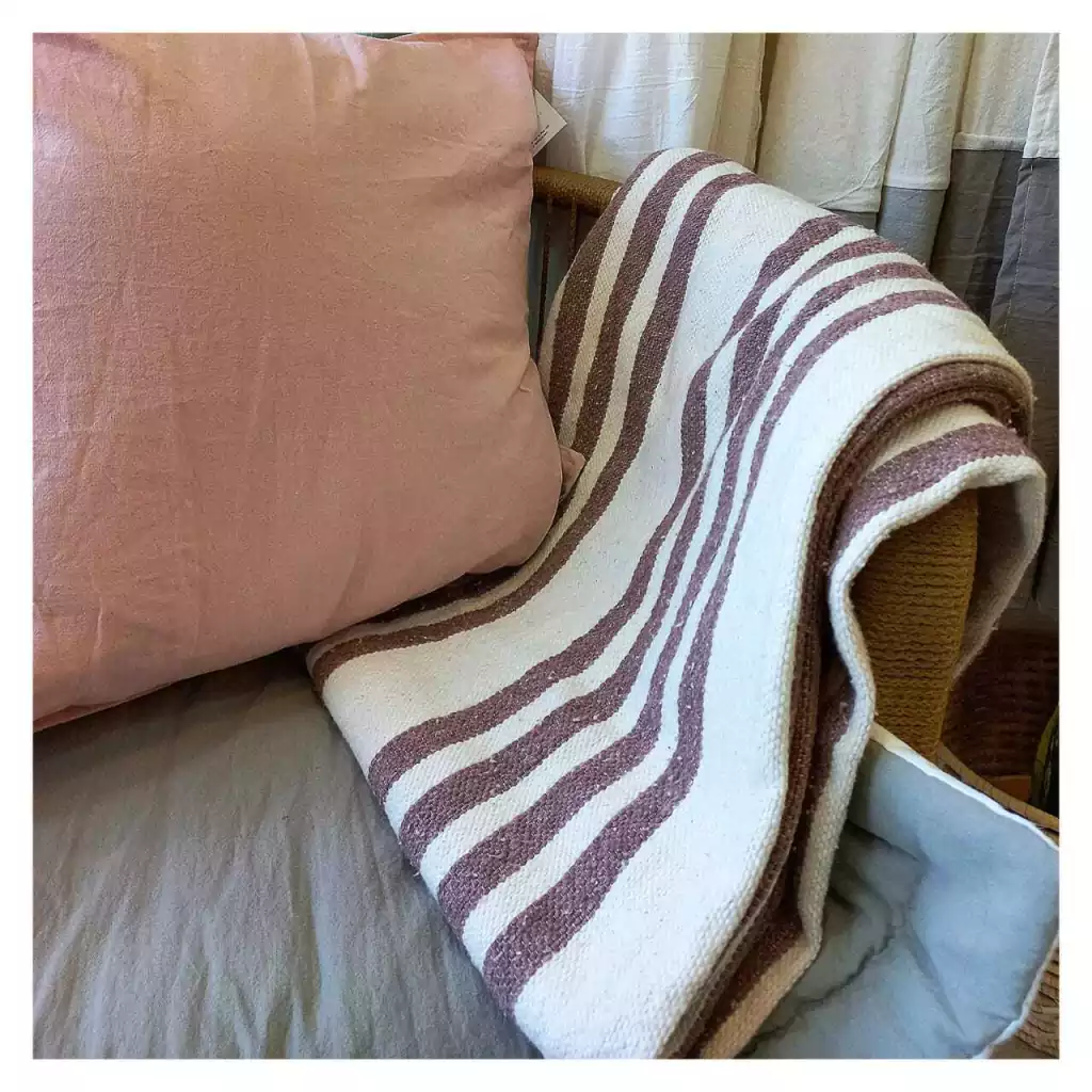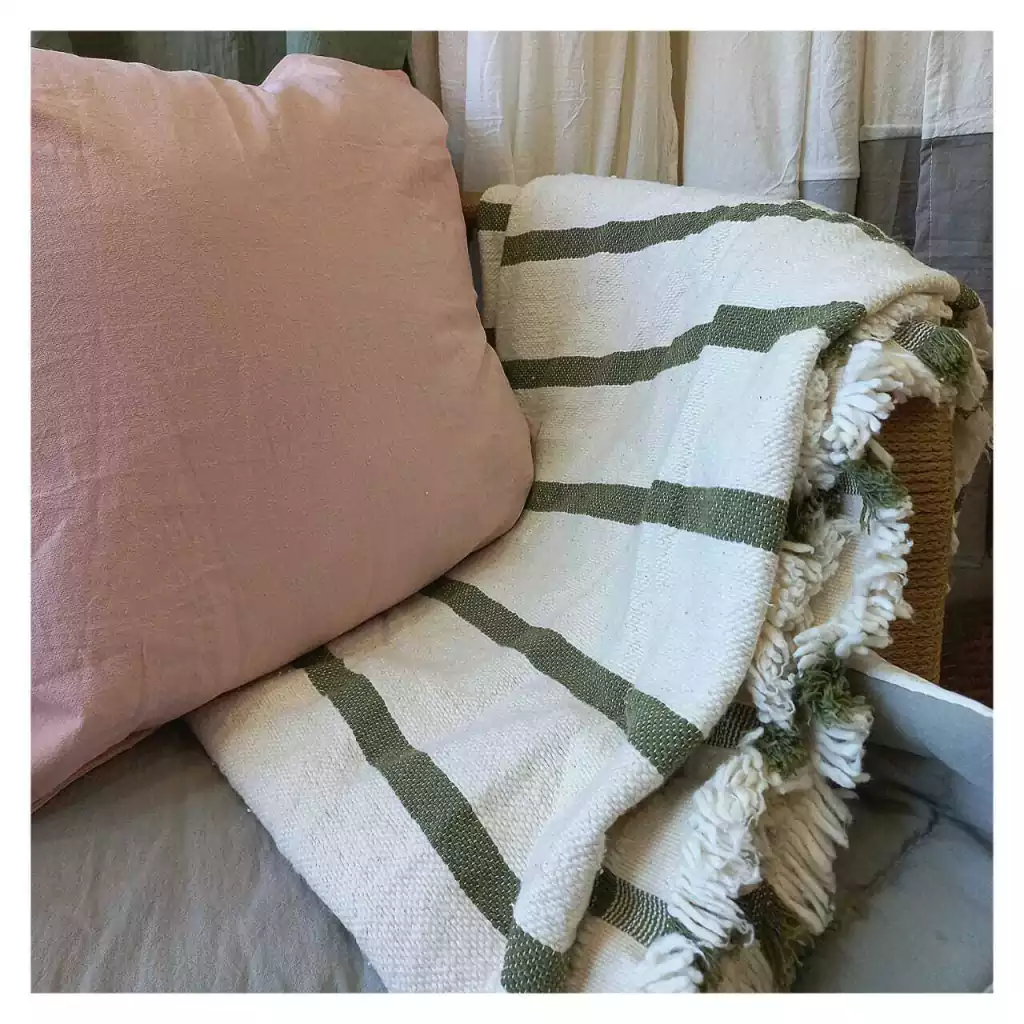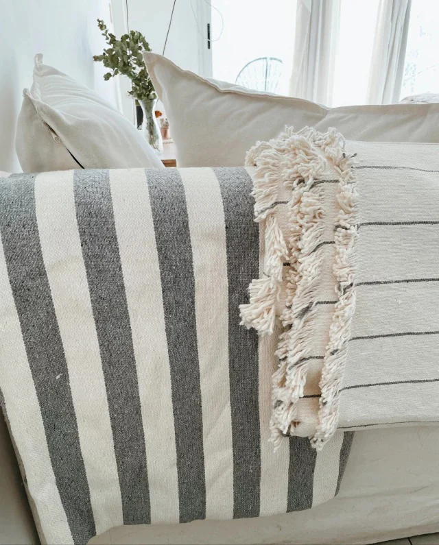 Diseño Artesanal: Destaca por su patrón de rayas sutiles y sus terminaciones con flecos hechos a mano, aportando un aire bohemio y sofisticado a tu decoración.