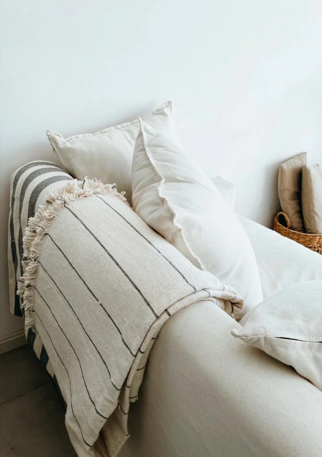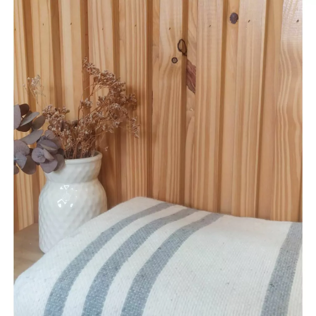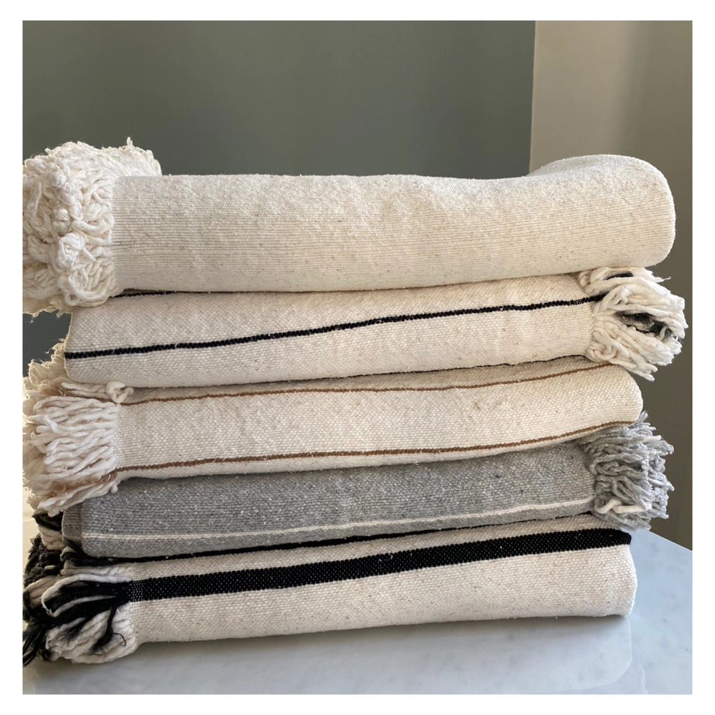Diseño Artesanal: Destaca por su patrón de rayas sutiles y sus terminaciones con flecos hechos a mano, aportando un aire bohemio y sofisticado a tu decoración.