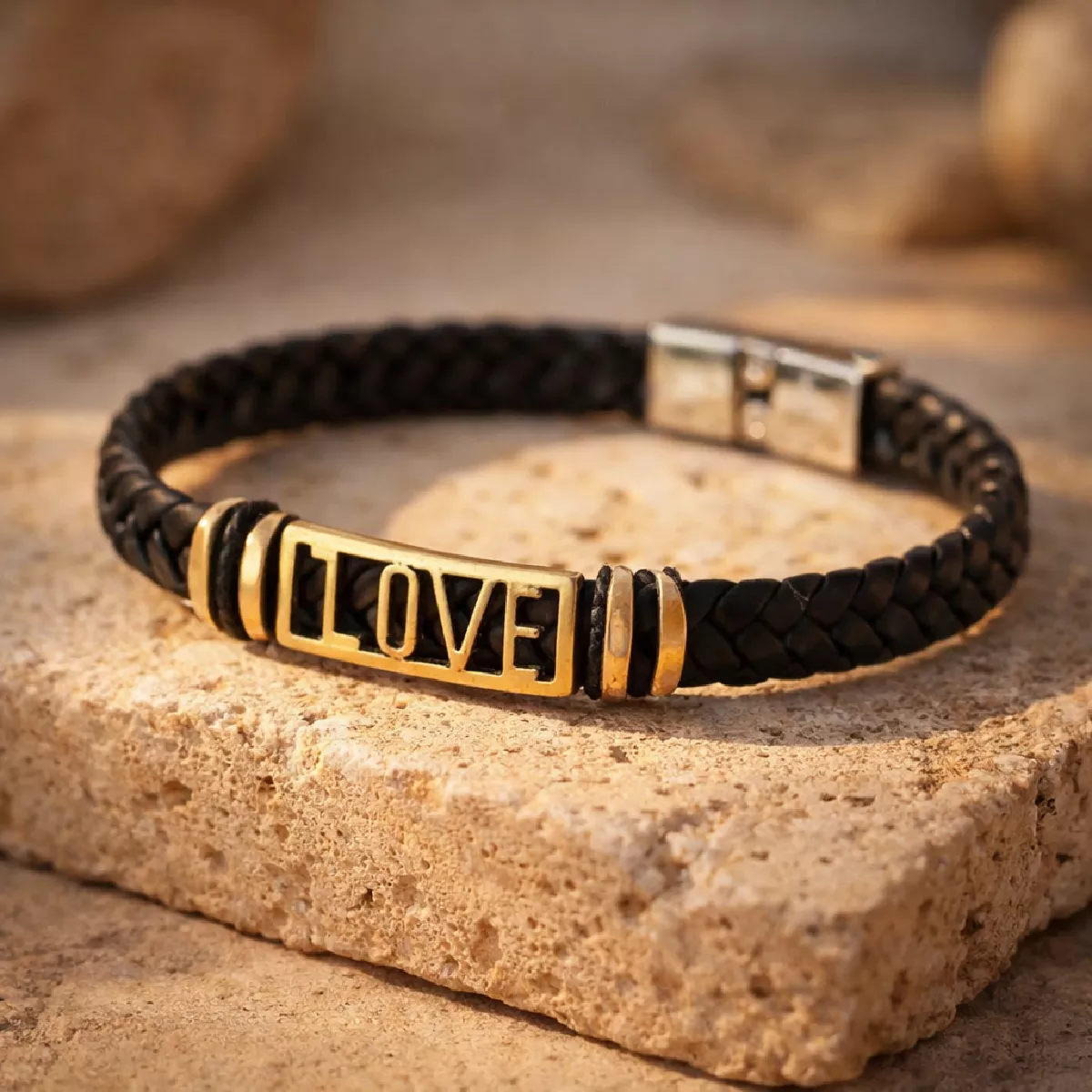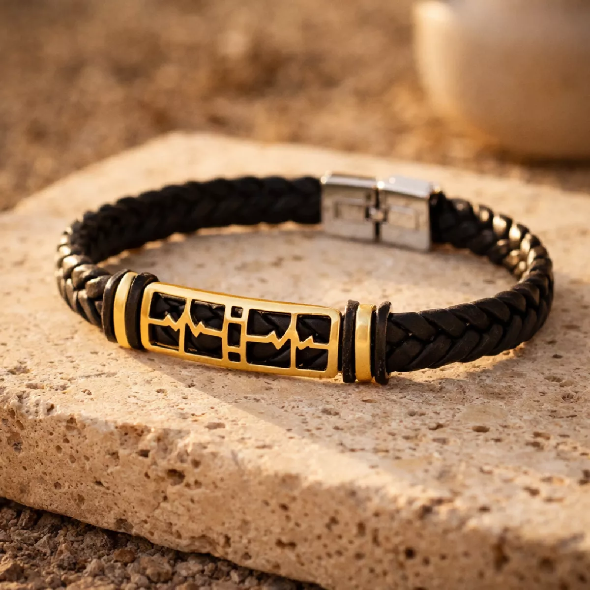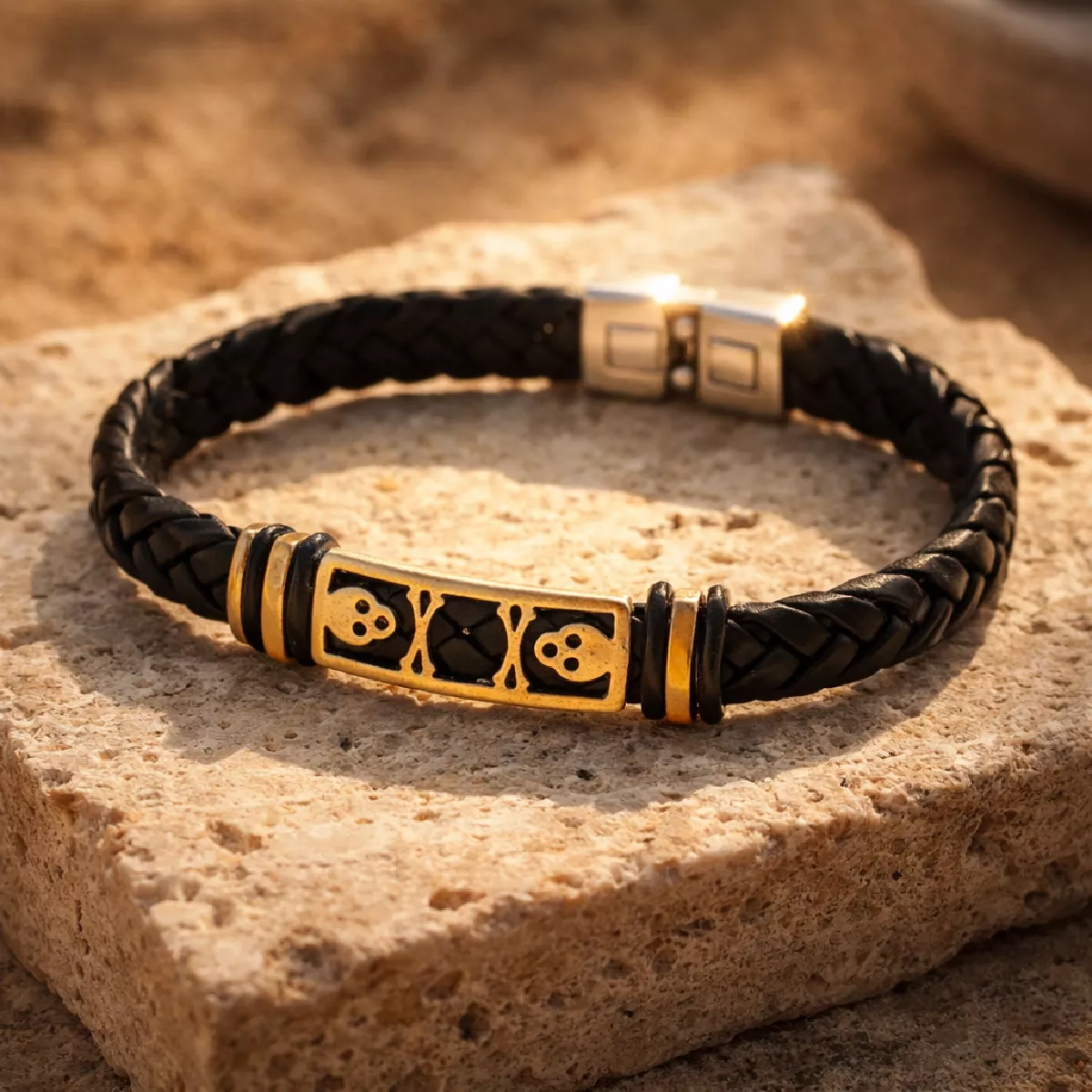 La pulsera de cuero Gold Pick sitúa la narrativa en el centro, utilizando placas metálicas con símbolos de significado profundo sobre una estructura textil robusta y artesanal. Una pieza que fusiona la calidez del tejido con la contundencia del metal, logrando un accesorio con peso visual y carácter propio, fiel al espíritu de Pachira.